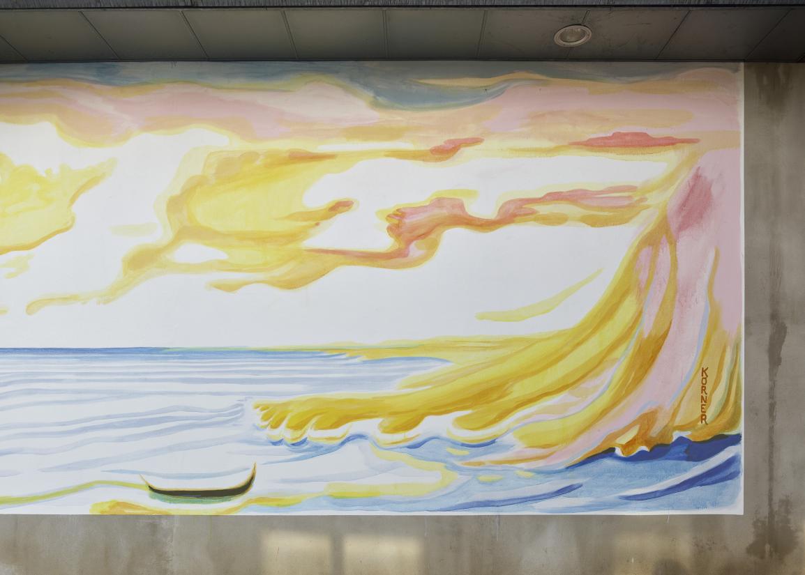 Vægmaleriet, der netop er færdiggjort og indviet, er skabt af billedkunstner John Kørner og tiltænkt som en forestillet rejse – en gåtur for øjet.