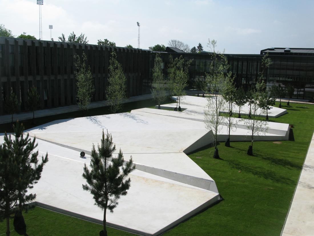 I sin enkelhed består den nye gårdhave, hvis realisering er støttet af Ny Carlsbergfondet, af en stor rektangulær græsflade, hvorpå der er lagt store, hvide asymmetriske betonfelter støbt på stedet. Betonfladerne hæver og sænker sig, således at der opstår varierende opholdsmuligheder. På græsset står skovfyr og sølvpil, hvis henholdsvis røde stammer og mørke nåle og pilens lyse stammer og lette løv giver et fint farvespil.