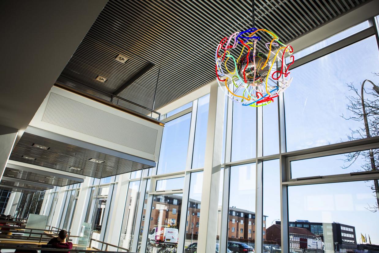 The three eye-catching pendant lamps at the IT Corner, Aarhus University are not only a treat for students and staff. Anyone passing by the building, which is situated close to the popular shopping mall Storcenter Nord, is bound to notice the luminescent sculptures through the building’s glass facade. Especially after dark.